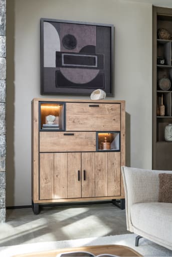 Dieses Highboard aus der Pavarotti-Kollektion hat einen ländlichen, aber dennoch modernen Look. Die Farbe Barnwood trägt viel dazu bei. Die Möbel bestehen aus Primo Laminato (HPL) und sind daher äußerst pflegeleicht. Auch die Akzente in schwarzem Metall benötigen wenig Pflege. All dies macht dieses Möbelstück, das sich als zentrales Prunkstück in Ihr Wohnzimmer einfügt, zu einer würdigen Ergänzung Ihres Interieurs. Das Möbel ist 125cm breit und 150cm hoch und besteht aus einer Klappe, einer Schublade und 2 geräumigen Schranktüren. Zusätzlich gibt es 2 kleine offene Fächer mit LED-Beleuchtung, die sich perfekt zur Dekoration eignen.