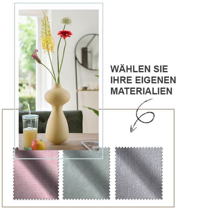 Bei den Materialien können Sie auf einen Stoff mit gröberer Struktur zurückgreifen: Dieser passt gut zum gemaserten Holz. Weiche Stoffe passen nicht so gut zur Maserung des Holzes. Wenn Sie trotzdem einen weicheren Stoff wählen, achten Sie dann darauf, dass er dunkel genug ist. Ein weicher, heller Stoff sollte hier lieber vermieden werden. Bei Vasen haben Sie eigentlich die Wahl: Kunststoff oder Keramik, wobei Keramik etwas natürlicher aussieht.