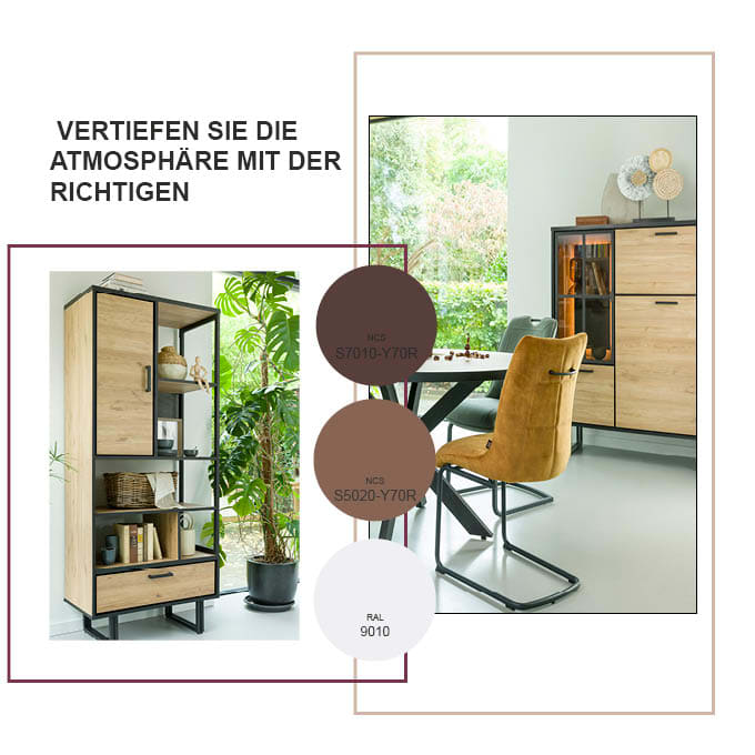 Die helle Holzfarbe der Möbel lässt sich wunderbar mit einer kräftigen Akzentfarbe an der Wand kompensieren. Wer lieber auf Nummer sicher gehen will, kann sich auch für Reinweiß (RAL 9010) entscheiden. Natürlich sind die Wände nicht die einzige Möglichkeit, um Farbakzente in Ihrem Interieur zu setzen. Auch Stühle und Sofas eignen sich hervorragend dafür und sogar eine Kombination von verschiedenen Farben oder Stoffen ist kein Problem mit einer neutralen Wandfarbe wie Weiß oder Grau. Dabei gilt: Je knalliger die Farben, desto gewagter die Einrichtung.
