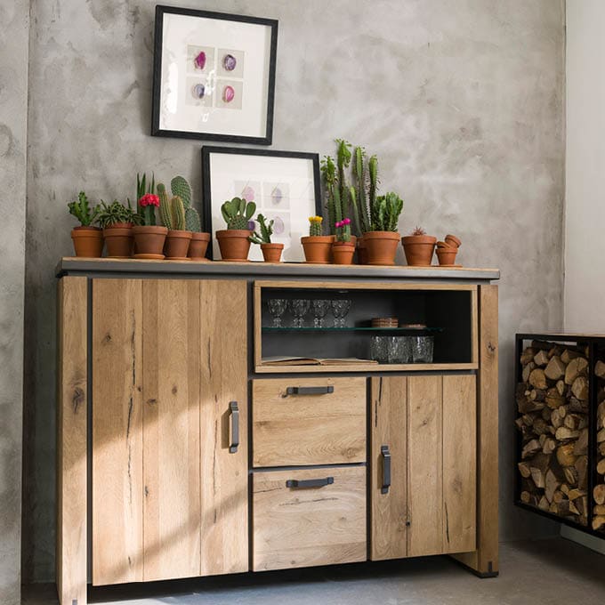 In einem rustikalen Ambiente trägt ein großes Möbelstück wie ein Büfettschrank wirklich zu einer schönen Atmosphäre bei. Sie können natürlich Ihr gesamtes Geschirr hineinstellen, aber zur Abwechslung können Sie auch eine schöne bunte Vase oder eine kleine Fettpflanze hineinstellen.