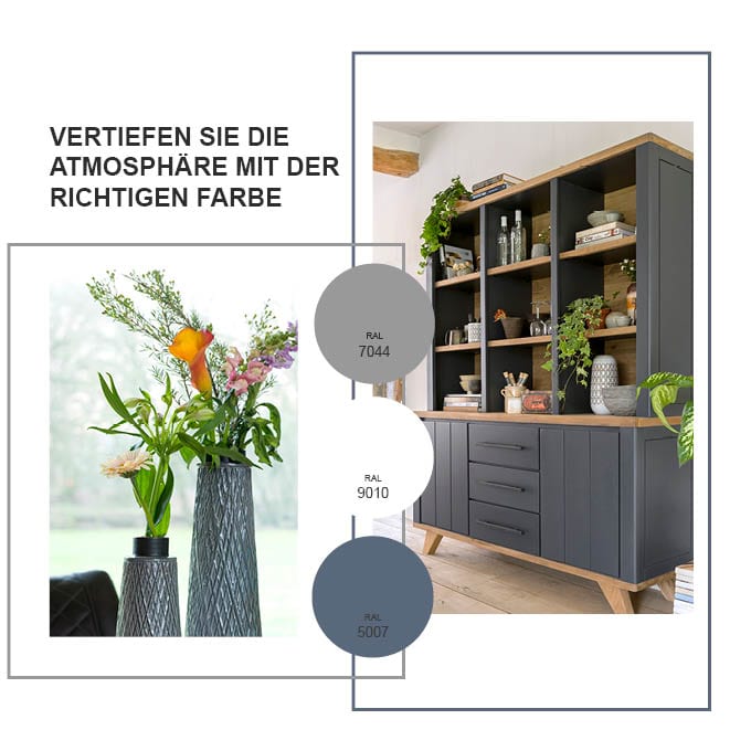 Die Kollektion Jardin/Jardino verfügt an sich schon über eine sehr unverkennbare Farbpalette, vor allem, wenn Sie eine Kombination aus dunkelgrauen und weißen Möbeln hinstellen. Um sicher zu gehen, dass dieses Mobiliar mit seinen auffallenden Farben in dem Raum gut zur Geltung kommt, wäre es ratsam, wenn Sie sich bei den Wänden für weniger ausgeprägte Farben entscheiden würden, damit sie gut mit den Möbeln harmonieren. Graue, weiße und weiche Blautöne sorgen dafür, dass Sie Ruhe und Einfachheit bekommen.